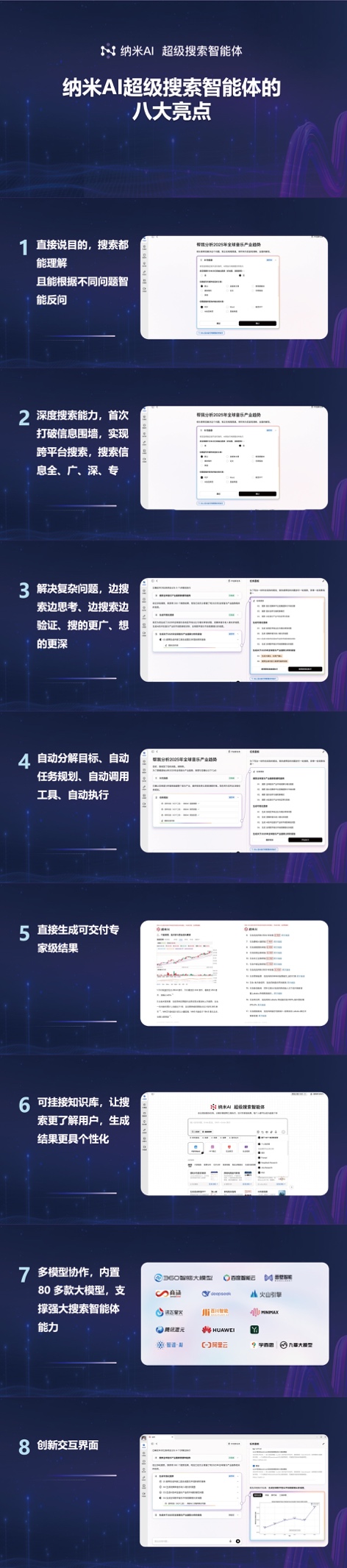360集团创始人周鸿祎正在发布会上引见,最终交付高质量的调研演讲;实现小红书、抖音、淘宝、京东、雪球等分歧平台跨平台搜刮,具备复杂使命的交付能力,内置国内80多款大模子,为大模子补齐四肢举动, 周鸿祎还透露,可以或许利用东西、完成复杂使命。用户能够清晰看到智能体正在处置问题时的每一个步调,大模子和智能体使用和全新AI硬件连系的“One more thing”,纳米AI超等搜刮智能体的推出,360发布了国内首个“超等搜刮智能体”——纳米AI超等搜刮智能体。之所以选择用智能体沉塑和搜刮,虽然目前大模子的能力越来越强,能够供给更为智能化的办事。